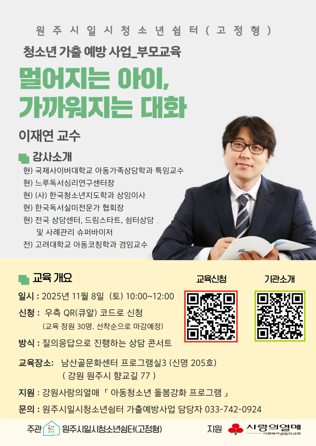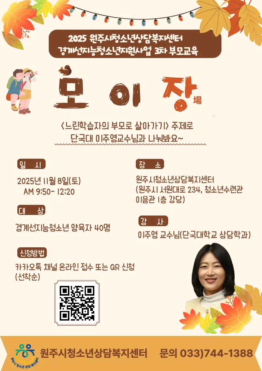원주시일시청소년쉼터에서 가출예방사업의 일환으로 부모교육을 진행합니다 ^^ 11월 8일 (토) 10~12시 남산골문화센터 많은 관심과 참여 부탁드립니다 ^^