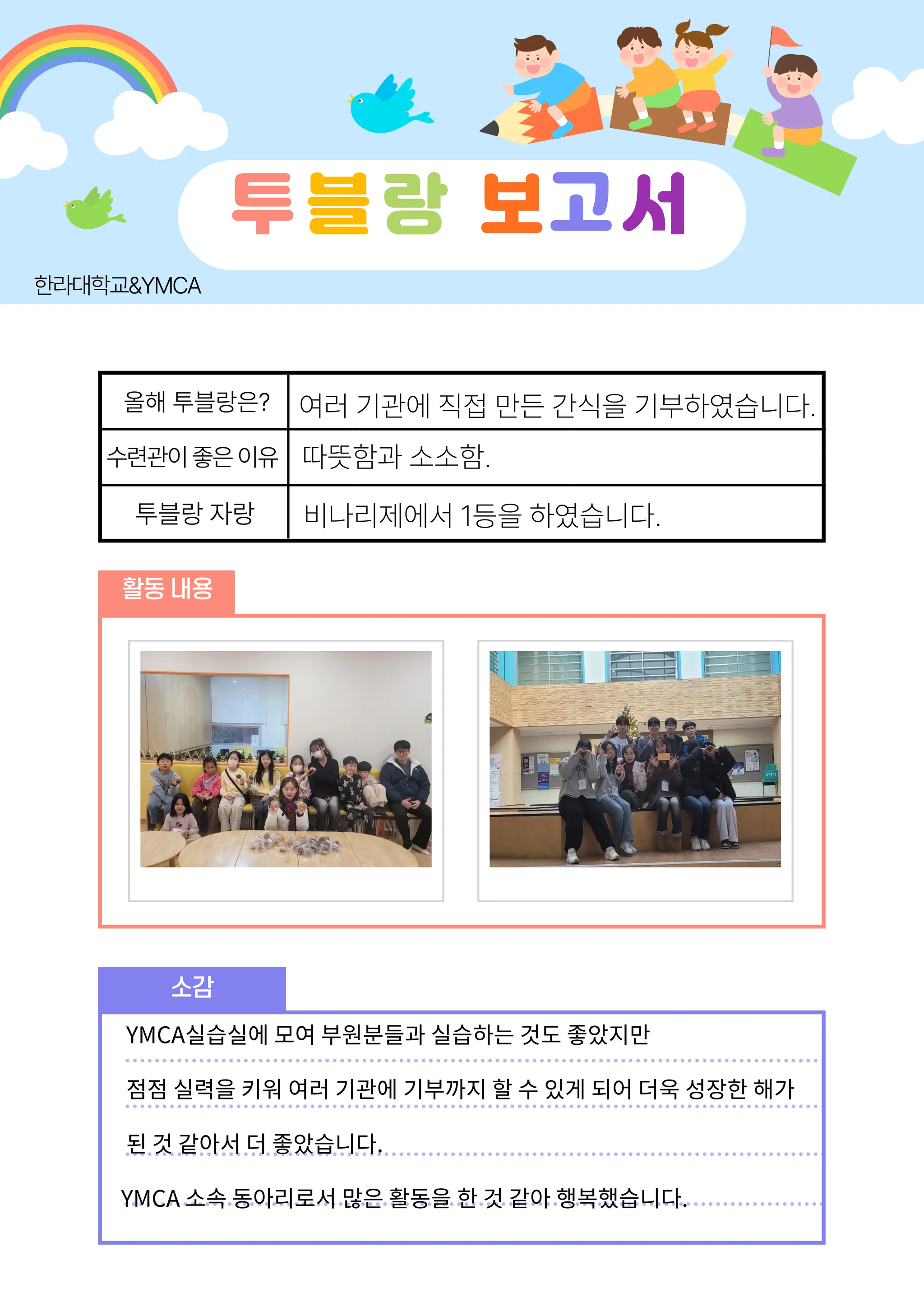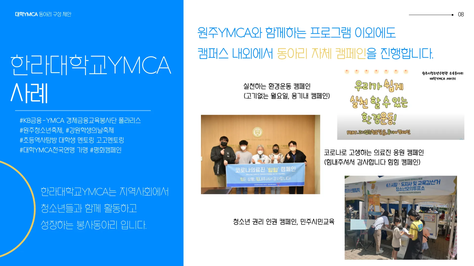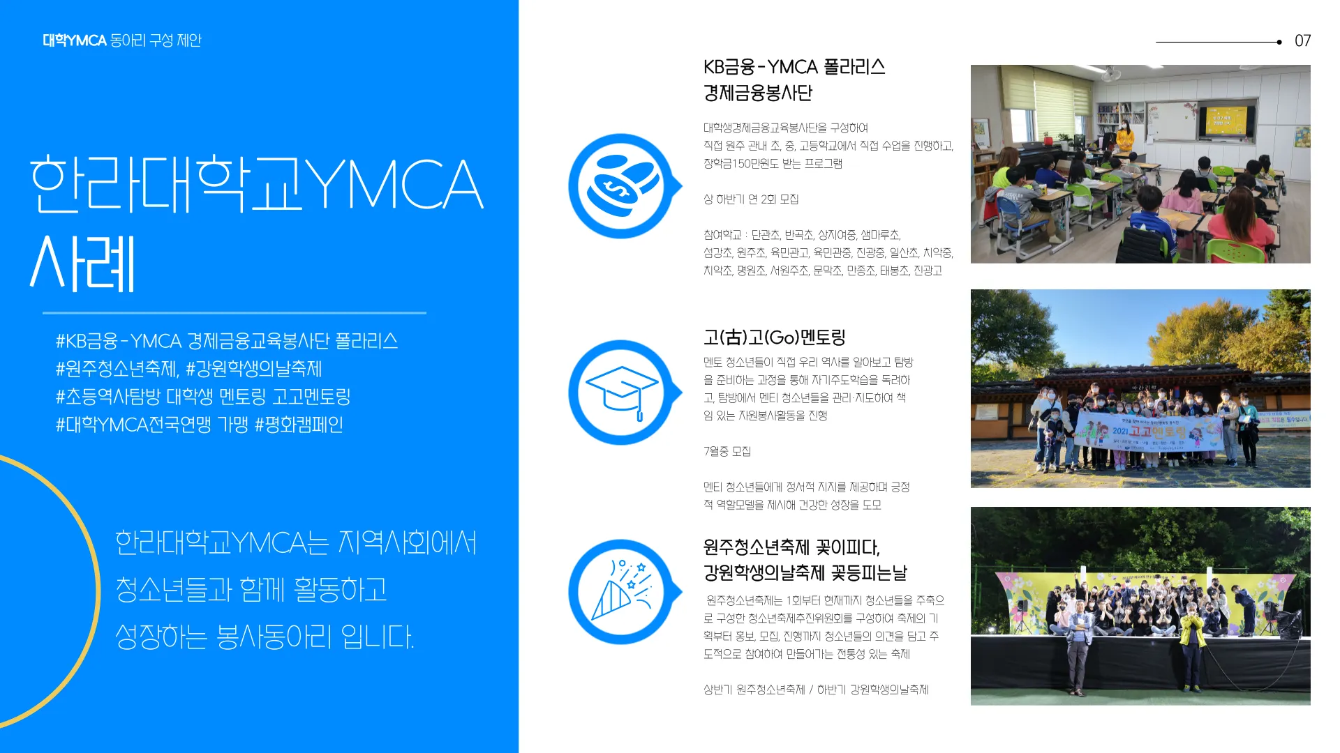 대학YMCA전국연맹에서 활동하는 한라대학교YMCA이며원주YMCA와 파트너쉽을 형성하고, 지역사회에서 봉사활동을 진행하고 있습니다.
