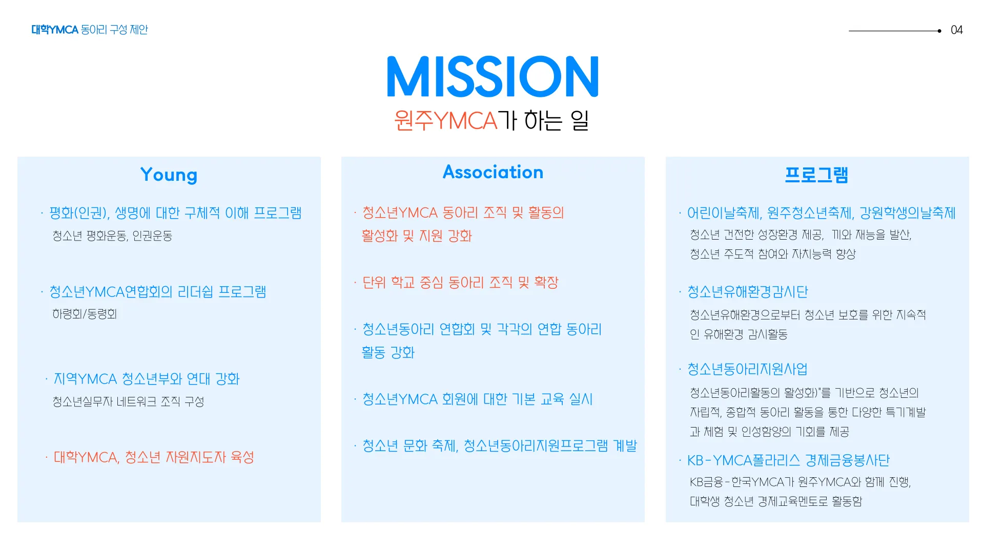 원주YMCA와 파트너쉽을 형성하고, 청소년 활동을 함께 진행하고 있습니다.