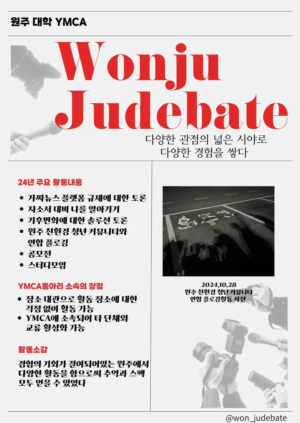 원주YMCA와 파트너쉽을 형성하고, 토론 및 봉사활동을 함께 진행하고 있습니다.