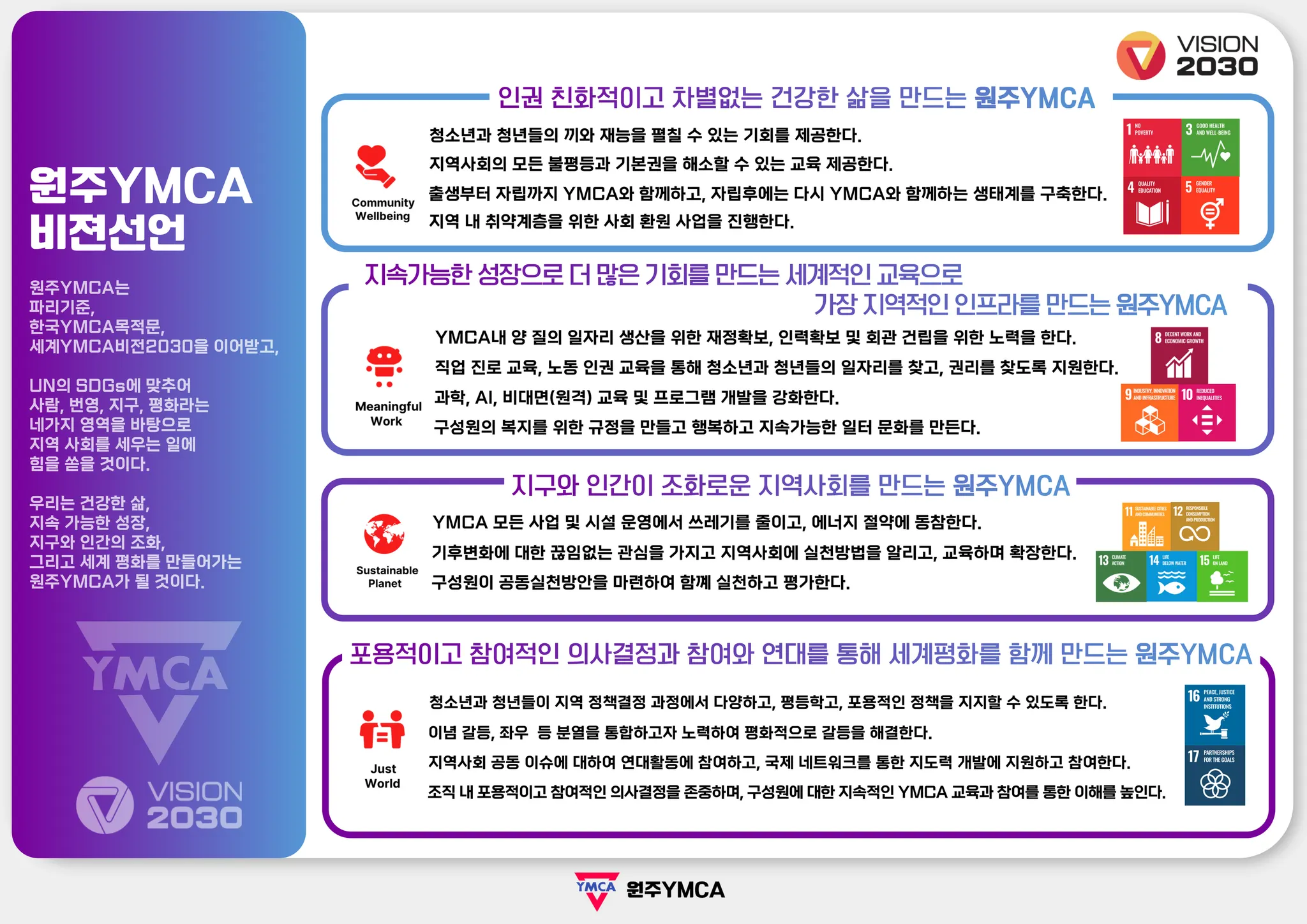 원주YMCA는 파리기준, 한국YMCA목적문, 세계YMCA비전2030을 이어받고, UN의 SDGs에 맞추어 사람, 번영, 지구, 평화라는 네 가지 영역을 바탕으로 지역사회를 세우는 일에 힘을 쏟을 것이다. 우리는 건강한 삶, 지속 가능한 성장, 지구와 인간의 조화, 그리고 세계 평화를 만들어가는 원주YMCA가 될 것이다.