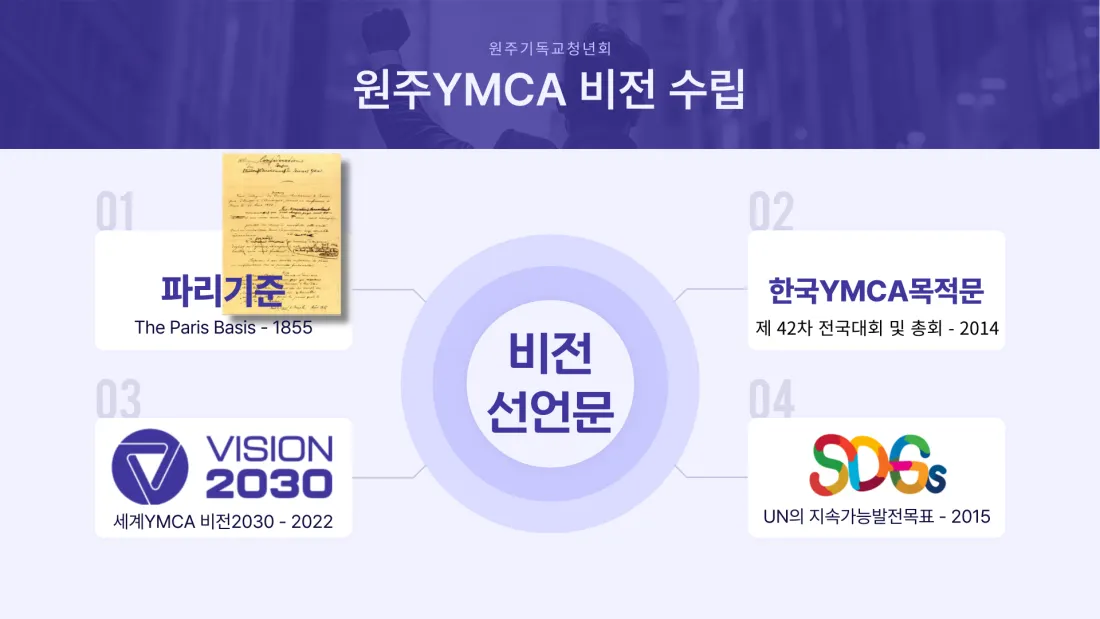원주YMCA는 50주년을 맞이하여 YMCA의 의미를 회복하고 새로운 50년의 운동을 재건하기 위해 파리기준, 한국YMCA목적문, 세계YMCA비전2030을 기반으로 지속가능발전목표(SDGs)에 맞춰 15가지 실천 아젠다와 46개의 실천과제이자 프로그램을 제시했습니다.